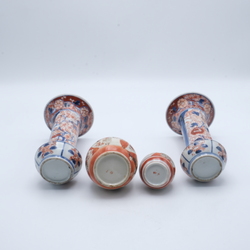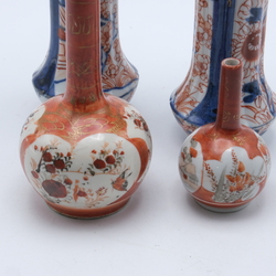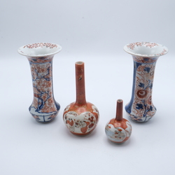 | Omschrijving | Lot van twee antieke 19e eeuwse Japans imari trompetvormige vazen en twee kutani pijpvaasjes, 8.5 – 19 cm hoog |