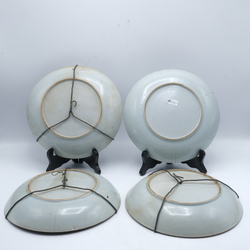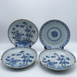 | Omschrijving | Vier Chinees 18e eeuwse Chinees porseleinen schotels. Blauw/wit met servetwerk, florale motieven in vlakverdelingenen sterrvormig op het plat. Qianlong periode |