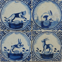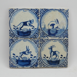 | Omschrijving | Vier antieke tegels, blauw decor van dieren, waaronder konijn, haas en geit, met in medaillon met Wanli-stijl hoekmotief. Rotterdam, 17e eeuw |
