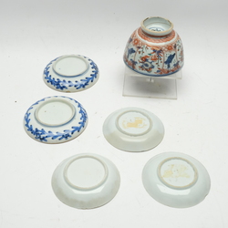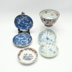 | Omschrijving | Vijf Chinees porseleinen schoteltjes, Imari en blauw/wit met decor van lijzen, zotjes en monniken in de tuin. Hierbij een Amsterdams bont kom met florale en vis motieven. |
