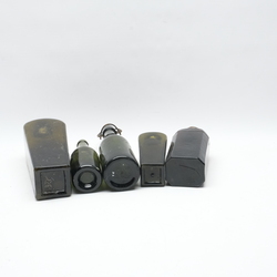 | Omschrijving | Lot van vijf groen en bruin glazen flessen, waaronder twee kelder- of jeneverflessen |