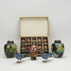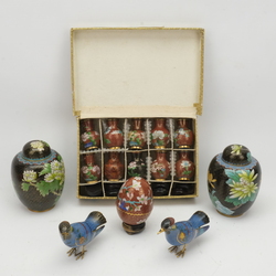 | Omschrijving | Een lot met vijtien stuks Chinees cloisonné op messing. Bestaande uit tien miniatuurvaasjes in doos met sokkels, twee gemberpotten, een ei en twee vogels. 20e eeuws. |