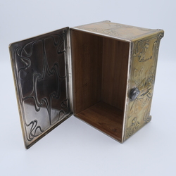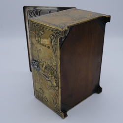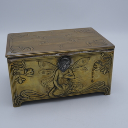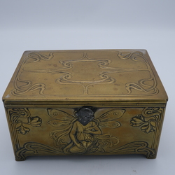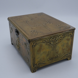 | Omschrijving | Een vroeg 20e eeuws Jugendstil of art nouveau messing kistje met floraal decor en vrouwengezichten in tin. Gemerkt WMF |