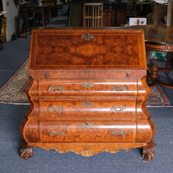 | Omschrijving | Een 20e eeuwse wortelnoten gefineerde secretaire met bronzen beslag, drie laden en binnenwerk met laadjes en kelder, geplaatst op klauwpoten |