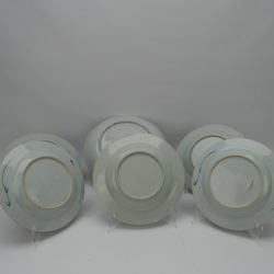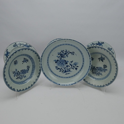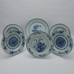 | Omschrijving | Lot van zes 18e eeuwse Chinees porseleinen borden met blauw-wit decor, Qianlong periode. Eén groter bord, doorsnede 27 cm |
