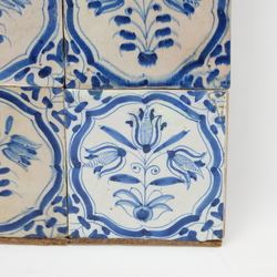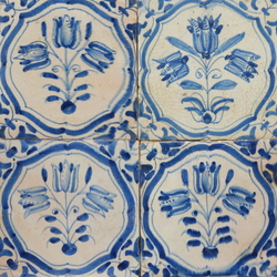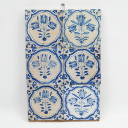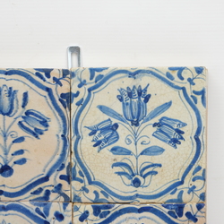 | Omschrijving | Zes antieke 17e eeuwse blauw-wit beschilderde tegels, decor van drie tulpen in medaillon |