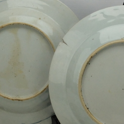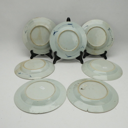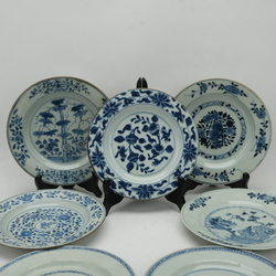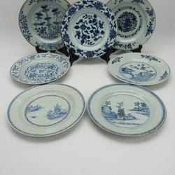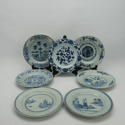 | Omschrijving | Zeven diverse 18e eeuwse schotels. Blauw/wit met Oosterse lanschappen en florale motieven. |