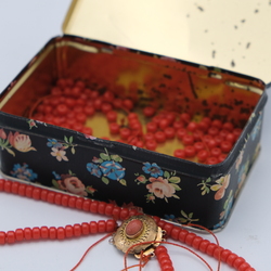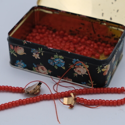 | Omschrijving | Een 14 karaats (585/1000) geelgouden slot voor vijfrijig bloedkoralen collier met rode kralen. Snoer gebroken |