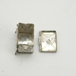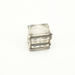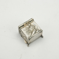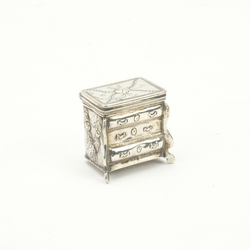 | Omschrijving | Een antiek 18e eeuws zilveren lodereindoosje in de vorm van een commode met drie laden, de zijkanten versierd met guirlandes, de achterkant met allegorische voorstelling. Onderop gemerkt 'IF' = Johannes Feddema, Leeuwarden (Voet 529), werkzaam vanaf 1780. Met stippelgravure 'S.P.' |