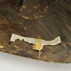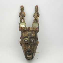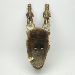 | Omschrijving | Een houten Afrikaans masker, deels beschilderd en met spiegeltjes gedecoreerd. Hoofdtooi is versierd met twee staande figuren. Volgens label een watersprintmasker uit Nigeria |