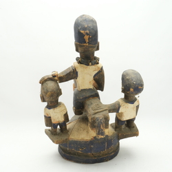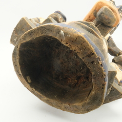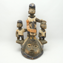 | Omschrijving | Een houten Afrikaans masker, deels beschilderd en met een hoofdtooi bestaande uit een ruiter met twee bij figuren |