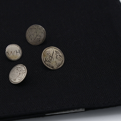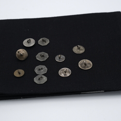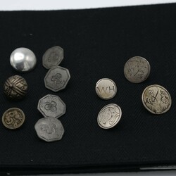| Omschrijving | Lot van elf oude knopen, waaronder enkele 18e eeuwse knopen. Vier achtkantig met voorstelling van een klaver, één met voorstelling van een vogel, één met initialen 'WH', twee met voorstelling van figuren (waarvan één met keur 'RVB') en drie ronde knopen. |