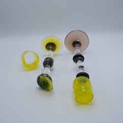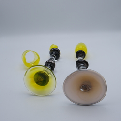 | Omschrijving | Twee design glazen kandelaars in het geel, paars en blank glas. Gemerkt aan de onderzijde Bernard Heese Oude Horn. |
