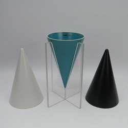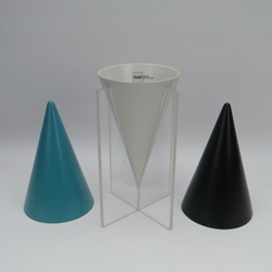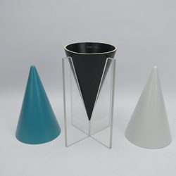 | Omschrijving | Drie aardewerken conische design vazen. In het zwart, wit en blauw. Ontwerp van Bert Pompe (1951-2012) voor oar wurk, Makkum. Met een origineel plexiglas houder, waar de vazen inpassen. |