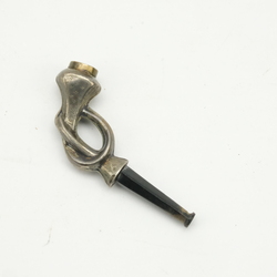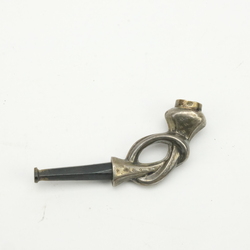 | Omschrijving | Een antiek 19e eeuwse tweede gehalte (835/1000) zilveren bruidegomspijpje in de vorm van een knoop, gegraveerd en met hoornen tuit. Gemerkt met zwaardje. |