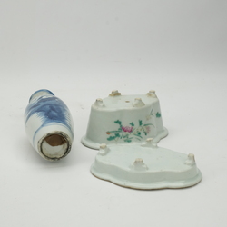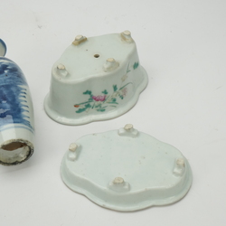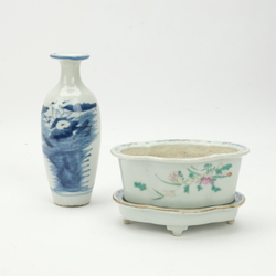 | Omschrijving | Een 19e eeuwse Chinees porseleinen jardiniere op onderschotel, met emaille decor van bloemen. Met daarbij een 19e eeuwse Chinees porseleinen blauwe vaas. Jardiniere 13 cm lang, vaas 16 cm hoog |