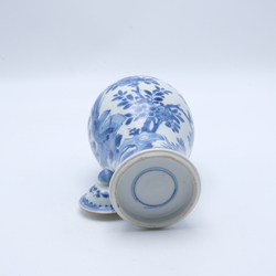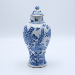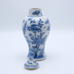 | Omschrijving | Een antieke Chinees porseleinen kastvaas met blauw-wit decor van vogel op tak en vlinders, met deksel |