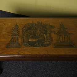 | Omschrijving | 20e eeuwse Chinese rozenhouten opiumtafel met steekwerk van o.a. tempels. Met glazen blad |