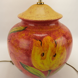 | Omschrijving | Een 20e eeuwse design tafellamp, gemerkt Hubert Olivier. Keramieken voet met beschilderd decor van tulpen en gele kap. |