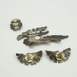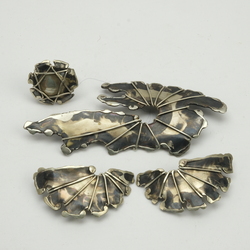 | Omschrijving | Een 20e eeuwse design verzilverde sieradenset, bestaande uit oorclips, broche en ring |