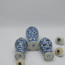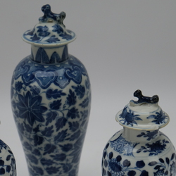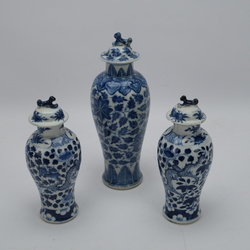 | Omschrijving | Lot van drie 19e eeuwse Chinees porseleinen kastvazen met onderglazuur blauw decor van draken en bloemen. Allen met deksel bekroond met tempelleeuwtje. Allen gemerkt met vierkaraktermerk. Hoogte 19,5 en 26 cm. Conditie: klein chipje grootste dekselvaas, één deksel kleine dekselvaas met chips. Eén kleine dekselvaas gelijmd. |