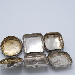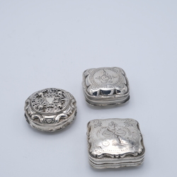 | Omschrijving | Lot van drie antieke 19e eeuwse tweede gehalte (833/1000) zilveren pillendoosjes, twee met gegraveerd decor en één met filigrain ingelegde deksel |