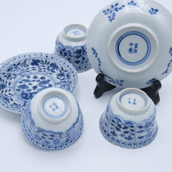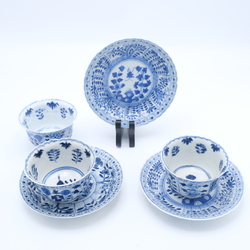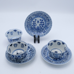 | Omschrijving | Lot van drie 19e eeuwse blauw-wit gedecoreerde Chinees porseleinen kop en schotels, met decor van bloemen op een rots. Gemerkt met vierkaraktermerk |