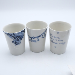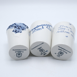 | Omschrijving | Drie porseleinen bekers. Van de ontwerpers: Irma Boon, Roderick Vos en Jurgen Bey. Met diverse decor in onder glazuur blauw. Gemerkt "Oandielhalderswearde", Tichelaar Makkum. |