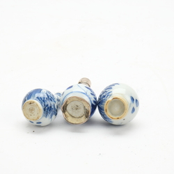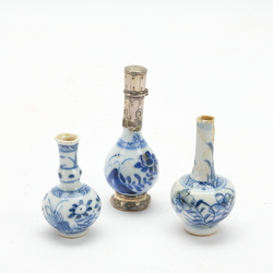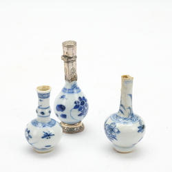 | Omschrijving | Lot van drie antieke 18e eeuwse Chinese miniatuurvaasjes: een knobbelvaasje, een pijpvaasje en flesvaasje met antieke 19e eeuwse zilveren monturen |