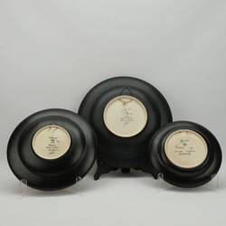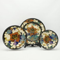 | Omschrijving | Drie platelen schotels in verschillende formaten. Met eeb polychroom floraal decor: Rosario. Gemerk Regina Holland. Ca 1930. |