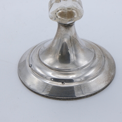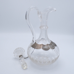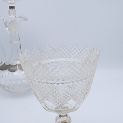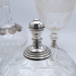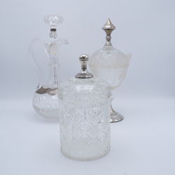 | Omschrijving | Lot van drie stuks antiek kristal: een kristallen beschuitbus met ruit- en sterslijpsel en tweede gehalte (835/1000) zilveren knop met parelrand. Een gembercoupe net ruitslijpsel en tweede gehalte zilveren voet en knop, mr, van Kempen. En een kristallen karaf, 19e eeuws, met ruitslijpsel en zilveren gegraveerd montuur |
