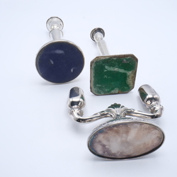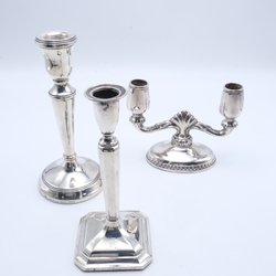 | Omschrijving | Lot van drie zilveren kandelaars: een eerste gehalte tweelichts kandelaar, gemerkt ‘925’ en ‘sterling’, een eerste gehalte ronde eenlichts kandelaar, 18,5 cm hoog, met inscriptie ‘Shell Pernis 1902-2002 en een eerste gehalte vierkante zilveren kandelaar, 17 cm hoog |