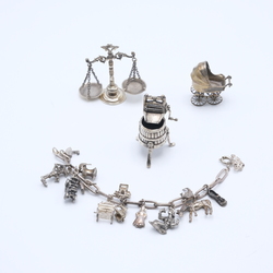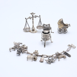 | Omschrijving | Lot van drie tweede gehalte (835/1000) zilveren miniaturen, wasmachine, kinderwagen en weegschaal. Met daarbij een zilveren bedelarmband met veertien zilveren bedeltjes |