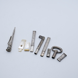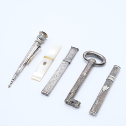 | Omschrijving | Drie 2e gehalte 835/1000 zilveren naaldenkokers en een breipenhouder. Waarvan één in de vorm van een sleutel. Hierbij een parelmoer naaldenkoker met vergulde aplicatie. Diverse graveringen en meesters, 19e eeuws. |