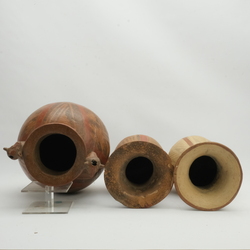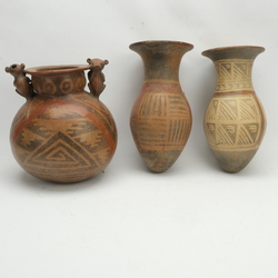 | Omschrijving | Drie Zuid Amerikaanse terracotta waterpotten. Twee met puntvormige onderzijde. De ander versierd met twee aapachtige figuren aan de bovenzijde. Alle drie beschilderd |