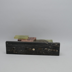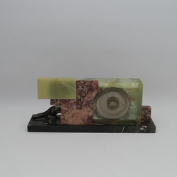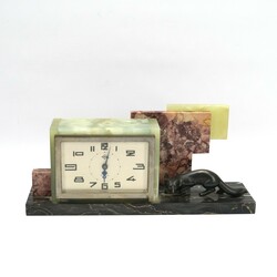 | Omschrijving | Een ART DECO onyx met marmeren tafelklok. Met een wit metalen verzilverde sculptuur van een vos. Achtdaags uurwerk van DEP, Frankrijk. Ca 1930 |