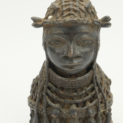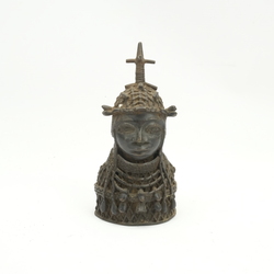 | Omschrijving | Een Benin bronzen buste van een figuur met diverse colliers en hoofdtooi, Zgn Head of Oba, altaarhoofd. 20e eeuws |