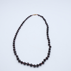 | Omschrijving | Een antiek granaten halssnoer van grote en kleinere geslepen granaten aan een 14 krt rose gouden staafsluiting |