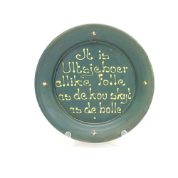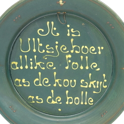 | Omschrijving | Een aardewerken spreukschotel. Met Friese spreuk: H't is de ultsje boer allike folle as de kou skyt as de bolle. Vroege Mobach ca 1915. |