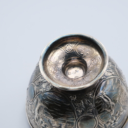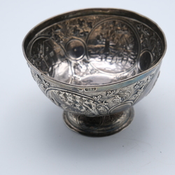 | Omschrijving | Een 1e gehalte (925/1000) zilveren roomkom. Met gedreven decors van landschappen en schaatserijder. Mr Hooikaas, voorzien van fantasiekeuren, Engelse keuren en Hollandse invoerkeuren. Jaarletter voor 1888. |