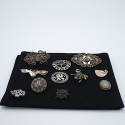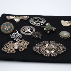 | Omschrijving | Lot van elf diverse broches. O.a. tweede gehalte (835/1000) zilveren broches gemaakt van kuitgesp, filigrain collierslot en bijbelslot, mr. Jacobus Barends Assen (1836-1847), een eerste gehalte (925/1000) zilveren broche in de vorm van een bloemenmand, een Italiaanse 20e eeuwse micromosaïek broche, twee Mexicaanse broches, één in de vorm van een kikker, en een eerste gehalte (925/1000) modernistisch zilveren broche, mogelijk Scandinavisch. |