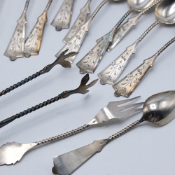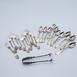 | Omschrijving | Een elf 2e gehalte, 835/1000 zilveren gebaksvorkjes en tien zilveren theelepels. Hierbij een zilveren klontjestang met hanenkam motief. Diverse meesters. |