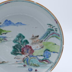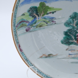 | Omschrijving | Een 18e eeuws Famille Rose bord met emaille beschildering van pagode in landschap, Qianlong periode. 22 cm doorsnede. Conditie: haarlijn (4 en 2,5 cm) en chip (5 mm) |