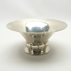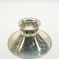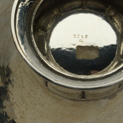 | Omschrijving | Een vroeg 20e eeuwse tweede gehalte (835/1000) zilveren schaal, gehamerd decor. Vermoedelijk Duits. Gemerkt met 'V', herkeur/belastingstempel in periode 1908-1953 |