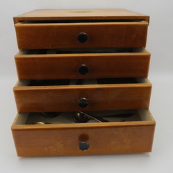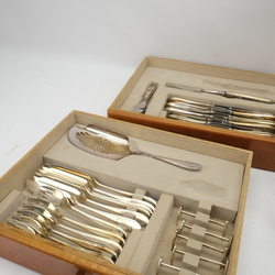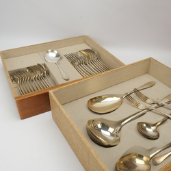 | Omschrijving | Een 20e eeuwse houten bestekcassette met vier laden, gevuld met verzilverd Gero Zilvium bestek. Onder andere zespersoons visbestek en visschep, messeen en messenslijper, klein en groot bestek en opdienlepels. Grotendeels gegraveerd met monogram 'KS' |