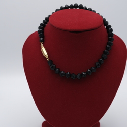 | Omschrijving | een 20e eeuws collier met gefacetteerde gitten en 14 karaats (585/1000) geelgouden langwerpig zeskantig slot. |