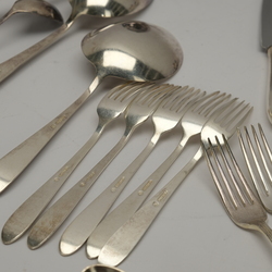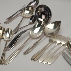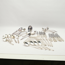 | Omschrijving | Een jaren '50 zespersoons verzilverd bestek, 39 delen. Enkele delen ontbreken. Ontwerp Gustav Beran (Wenen 1912 - Bern 2006) voor Keltum, model P3. Met daarbij enkele andere stuks verzilverd bestek en een tweede gehalte zilveren vorkje. |