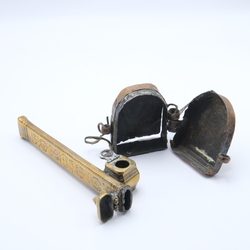 | Omschrijving | Lot divers: een 19e/20e eeuws inktpotje en pennenhouder, Midden-Oosten, zgn. Qalamdan. Met daarbij een antiek 19e eeuws TIbetaans koperen gao doosje voor relieken |