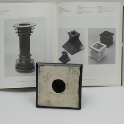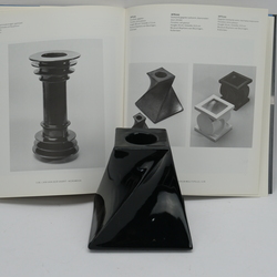 | Omschrijving | Een porseleinen getorste kandelaar. Met zwarte glazuur. Gesigneerd Van der Vaart 1979 (= Jan van der Vaart (1931-2000). Hierbij het boek over de kunstenaar, waar de kandelaar in staat afgebeeld. |