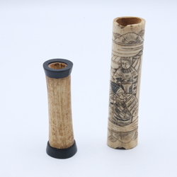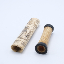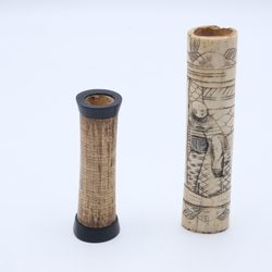 | Omschrijving | Lot van twee stuks been: een antiek Japans benen heft met decor van figuren en een Sumatraanse benen medicijnkoker |
